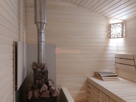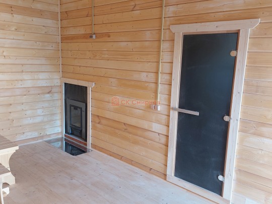 Установка печи Теплодар Русь сетка 12 л панорама ( со стеклянной дверцей ), трубы сэндвич, проходы и зонт входят в стоимость бани. Экран металлический через стену. На полу кладется кирпич, базальтовый картон, минерит. На стенах базальтовый картон, минерит, через втулки прикручивается минерит. Ссылка на сайт производителя https://www.teplodar.ru/catalog/detail/rus_setka_12_l_panorama/