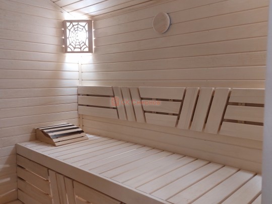 В бане из кедра не стоит обшивать стены вагонкой, так как кедр выделяет очень мало смолы и это не помешает пользоваться комфортно баней, потолок обшит кедровой вагонкой. Пологи из кедровой доски.