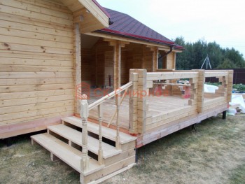 На террасе при условии что она есть делаем перила из строганной доски со всех сторон, столбы террасные также строганные, а не обрезки профилированного бруса с шипом и пазом. Домкратики на столбах для дальнейшей регулировки. Балясины будут сделаны аккуратно. Обратите внимание что в дешёвых случаях это может быть и будет просто вагонка прибирая к неотесанной доске снаружи и столбы будут не квадратные а просто профилированный брус как на видео.