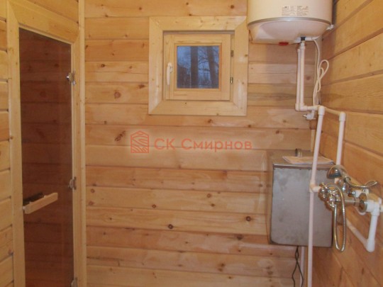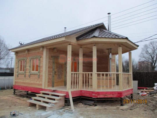 Такая одноэтажная баня 6х8 может быть построена из любого типа бруса. Ориентировочный срок строительства 21 день.