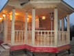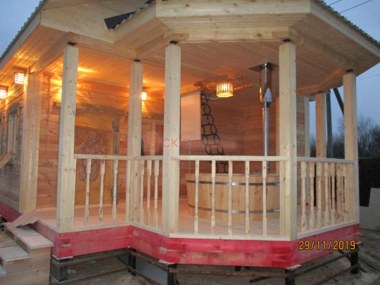 На террасе при условии что она есть делаем перила из строганной доски со всех сторон, столбы террасные также строганные, а не обрезки профилированного бруса с шипом и пазом. Домкратики на столбах для дальнейшей регулировки. Балясины будут сделаны аккуратно. Обратите внимание что в дешёвых случаях это может быть и будет просто вагонка прибирая к неотесанной доске снаружи и столбы будут не квадратные а просто профилированный брус как на видео.