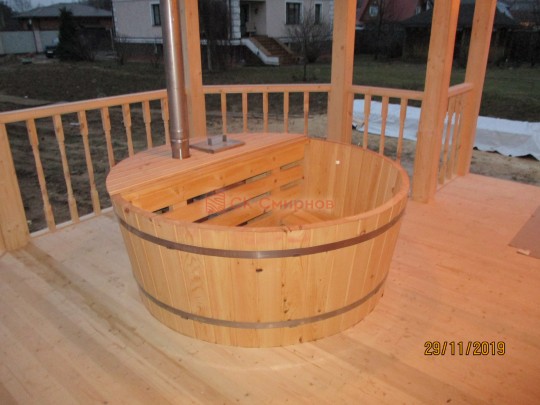 Купель расчитана на 3-4 человека. Оснащена погружной печью и тентом. Нагревается за 3 часа, остывает примерно 5 часов.