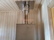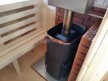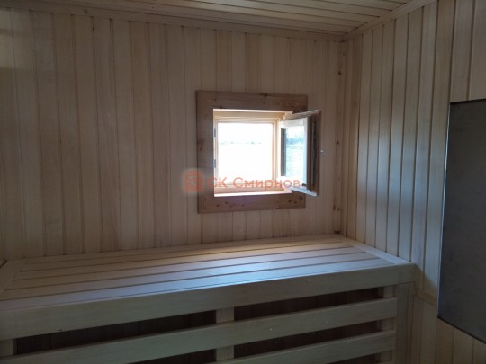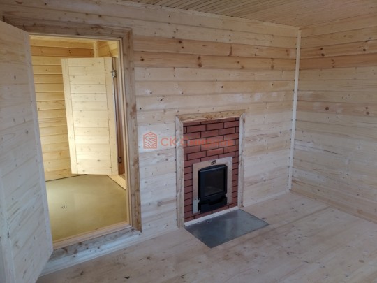 Внутри планировка вполне простая: есть прихожая, большая комната для отдыха, помывочное помещение с выведенным краном и парная. Установлена отличная печь Теплодар с панорамной дверцей. Топка вынесена в комнату и обложена кирпичом: безопасно, красиво, аккуратно.