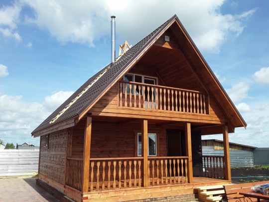 На террасе при условии что она есть делаем перила из строганной доски со всех сторон, столбы террасные также строганные, а не обрезки профилированного бруса с шипом и пазом. Домкратики на столбах для дальнейшей регулировки. Балясины будут сделаны аккуратно. Обратите внимание что в дешёвых случаях это может быть и будет просто вагонка прибирая к неотесанной доске снаружи и столбы будут не квадратные а просто профилированный брус как на видео.